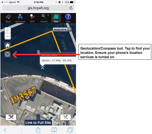 On the left side of the map, there is a Compass icon. Tapping this will place the user's physical location on the map. (Please note if the user is operating with an Android phone and a Chrome browser, this geolocation feature may not function properly. Make sure your Location Services is turned on in your phone's settings):