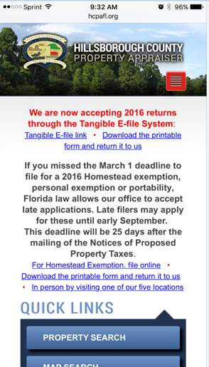 Welcome to the HCPA's Quick-Start Guide to our office’s first-ever mobile website. This guide is meant to be an overview of the site’s features. Before you begin, one step we recommend is to clear the cache/browsing history and website data from your mobile device. For additional details on how to use the mobile site, tap on the Question mark/Help icon located in the upper right hand corner of each mobile site page, or call the HCPA at (813) 272-6100.