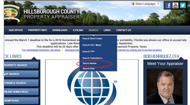 If a user wishes to use the mobile Site on their iPad or tablet device, there is a link to it on the HCPA home page. This link is found under the home page’s main navigation bar along the top of the page. Tap or click on SEARCH, then select "Search Mobile" under the possible choices.