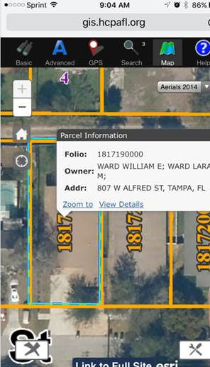 Tapping "Zoom to" will bring the user to the parcel boundary level and bring up the corresponding Parcel Information box. From here, the user can also tap nearby parcels to bring up the Parcel Information box for those properties.
